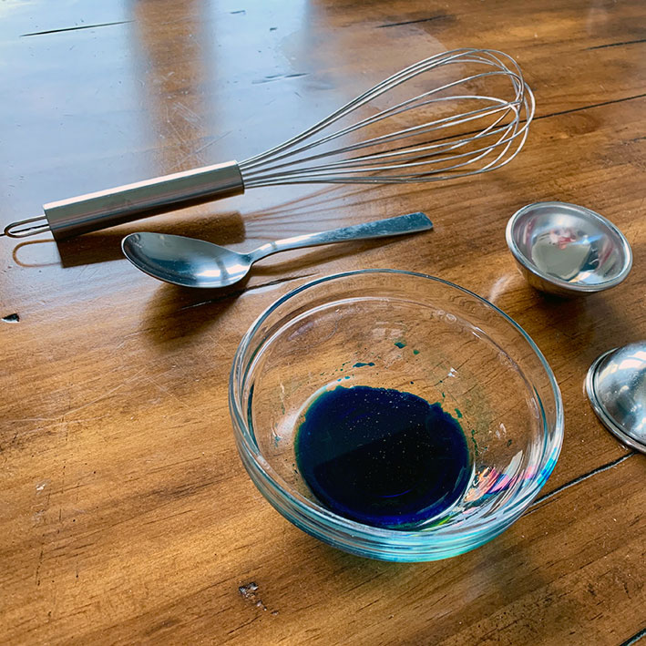 - Mix the liquids into a small bowl: Essential Oil, Oil (Sunflower, Coconut oil etc – optional), Food Colouring and Water.