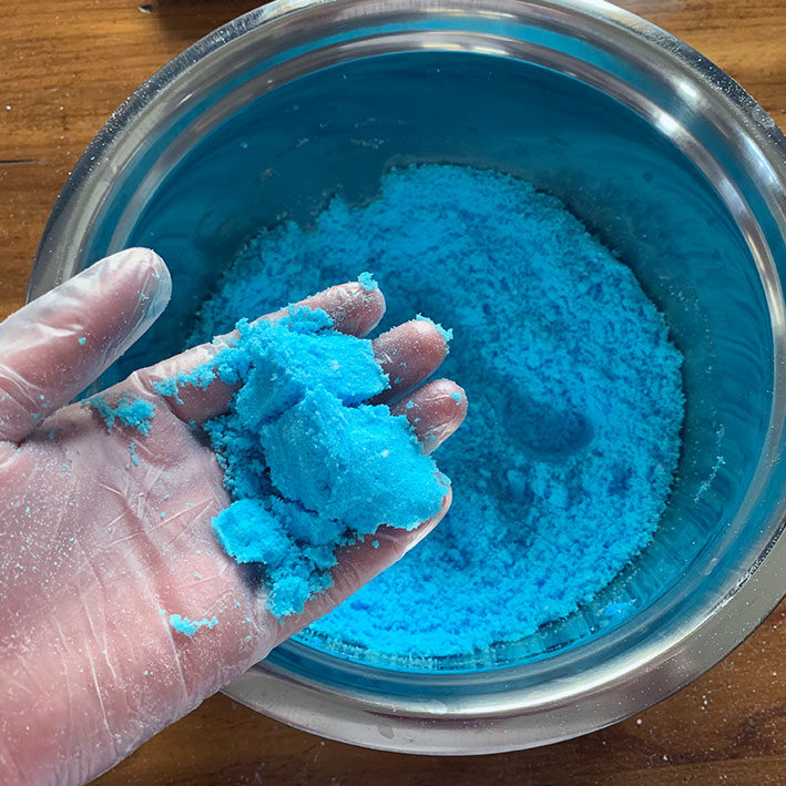 - Gently and steadily mix the liquids into the dry ingredients a small amount at a time, otherwise the liquids will react with the citric acid. Tiny drops at a time as it clumps together into a slight clump together when pressed together. Be careful not to make it too wet and soggy.
